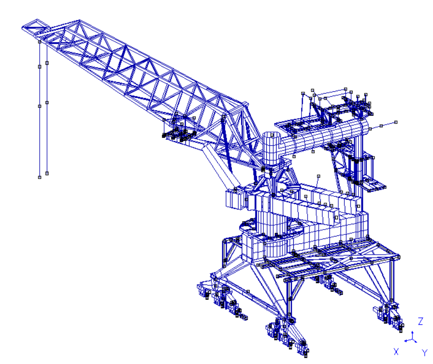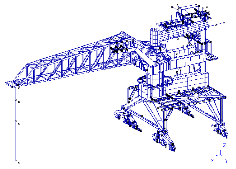 Eigene Leistung: Modellierung der Kinematiken in Krasta mit 4 Auslegerdrehungen, 3 Auslegerneigungen und 9 verschiedenen Lagerbedingungen, sowie 3 Ausfallzustände für Hydraulikzylinder. Damit Untersuchung von 156 Situationen = 156 verschiedene statische Modelle. Weiterhin werden im Krasta Windprofile und situationsabhängige Lastfälle verwendet. Bei einem Gesamt-Rechendurchlauf werden ca. 64.000 Lastereignisse untersucht.